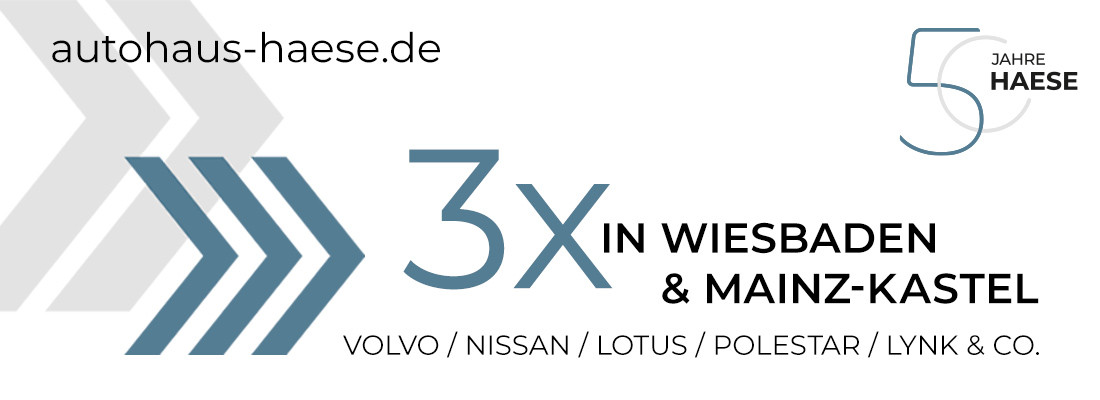Horaires d'ouvertureAutorisierter VOLVO, LOTUS, NISSAN Vertragspartner / Autorisierter POLESTAR und LYNK & CO Servicepartner. Exclusive VOLVO Military, Nato & Diplomat Sales. Das inhabergeführte Familienunternehmen setzt seit jeher auf zwei wesentliche Faktoren: die erfolgreiche Kombination von innovativen Ideen und langjähriger Erfahrung. Zwei Faktoren, die in sämtlichen Bereichen des Unternehmens Treiber für Motivation und Performance darstellen: im Verkauf, im Service und auch im Back-Office. An drei Standorten in Wiesbaden und Mainz-Kastel vertreibt Autohaus HAESE die Marken VOLVO, LOTUS und NISSAN, inklusive aller Werkstatt- und Serviceleistungen. Hochqualitative Gebrauchtfahrzeuge werden über das eigene Gebrauchtwagenzentrum vertrieben. Darüber hinaus ist Autohaus HAESE Servicepartner für die Marken POLESTAR und LYNK & CO. Ein Team von mittlerweile über 90 Mitarbeitern kümmert sich um die Wünsche und Anforderungen von mehr als 5.000 Stammkunden sowie den Verkauf von mehr als 1.100 Neu- und Gebrauchtfahrzeugen im Jahr. Innovationen finden aber auch außerhalb des Kerngeschäfts Verkauf und Service statt. Hier integriert Autohaus HAESE Leistungen in das Gesamtportfolio, die in ein gesellschaftliches Leitthema unserer Zeit hineinspielen: Mobilität. Und zwar Leistungen, die Mobilität nicht nur im sprichwörtlichen Sinn bereitstellen, sondern Mobilität erst ermöglichen und planbar machen. Autohaus HAESE betreibt seit einigen Jahren unter der Marke HAESE Mobil eine eigene Autovermietung – nicht nur für seine Stammkunden, sondern auch als freier Anbieter am Markt. Eine absolute Innovation ist die Entwicklung und der Vertrieb einer herstellerunabhängigen Ladekarte für öffentliche E-Ladestationen sowie eine One-Stop-Solution für E-Ladestationen und Wallboxen im privaten oder gewerblichen Rahmen (Full Service für Planung/Bau/Versorgung).