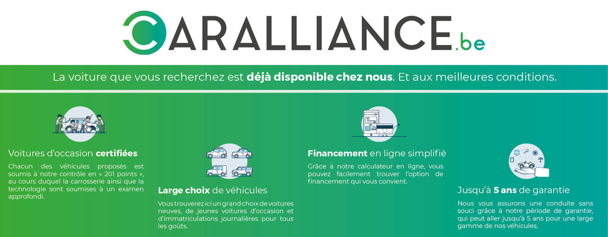 Horaires d'ouvertureCar Alliance, dont les membres sont les garages Centracar, Ebac, Xclusive Cars, Boel, et Leleu offre un service de haute qualité et vous propose un large choix de véhicules neufs et d'occasion. Bénéficiez de plus de 150 ans d'expérience cumulée à votre service. Car Alliance rassemble des garages partageant des valeurs communes et familiales : compétences multiples, expérience, large choix, tarification avantageuse et proximité. Notre objectif est de mettre à votre disposition une très large sélection de véhicules neufs, de stock et d’occasion à des prix concurrentiels, livrés dans des délais brefs auprès du garage de votre choix. De plus, nous offrons également la possibilité de commander des véhicules entièrement personnalisables, répondant ainsi aux envies et besoins spécifiques de chaque client.