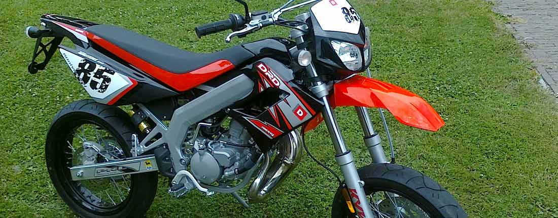 L’arrivée de ce deux-roues de 124,2 cm³, fidèle aux modèles Enduro sur le marché, s’est faite en même temps que sa version supermotard. Avec la DRD 125R, Derbi a visé le créneau des loisirs, qui permet un roulage confortable sur route, tout en s’adaptant aux incursions plus sportives en hors-piste. Considérée comme une véritable jumper avec ses pneus à crampons et une jante de 18 po. à l’arrière et 21 po. à l’avant, elle s’avère une moto agile qui se plie aisément aux exigences de la route. Ses suspensions souples contribuent à une maniabilité agréable et son mono-amortisseur arrière encaisse bien les défauts d’un terrain accidenté. D’une puissance de 15 CV avec un moteur à 4 temps monocylindre, la DRD 125 R affiche un poids à sec de 120 kg. À l’instar de la DRD SM, la R est équipée d’un châssis rassurant qui allie souplesse et solidité. Disponible en bleu et en noir, le design moderne de ce véhicule correspond aux tendances actuelles qui plaisent beaucoup aux jeunes.