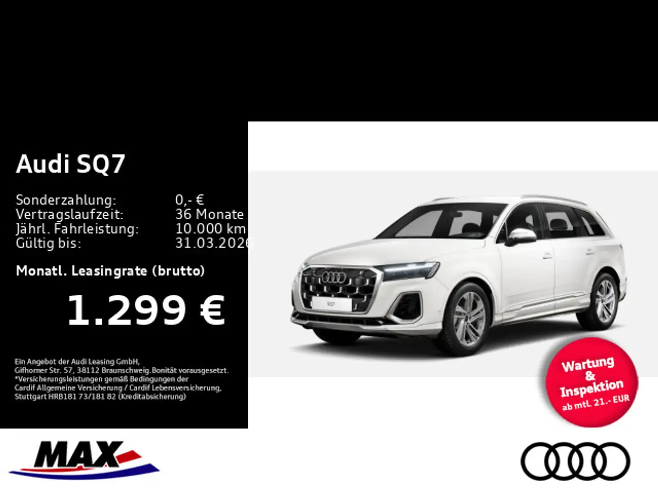 Dieses Angebot bezieht sich auf ein Bestellfahrzeug, das frei konfigurierbar ist., Wir nehmen gerne den Audi-Code Ihres Wunschfahrzeugs entgegen, um Ihnen ein maßgeschneidertes Angebot zu erstellen., Den Audi-Code erhalten Sie nach erfolgreicher Konfiguration Ihres Fahrzeugs auf der Website des Herstellers (Modelle | Audi Deutschland)., Die Leasingrate kann je nach individueller Fahrzeugkonfiguration variieren., Selbstverständlich können Sie uns auch bezüglich kurzfristig verfügbarer Lagerfahrzeuge kontaktieren.