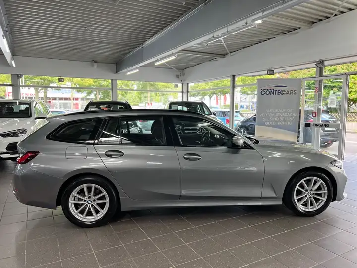 Dieser gepflegte BMW 318 Kombi aus dem Jahr 2022 präsentiert sich in elegantem Grau Metallic mit schwarzer Stoffausstattung.