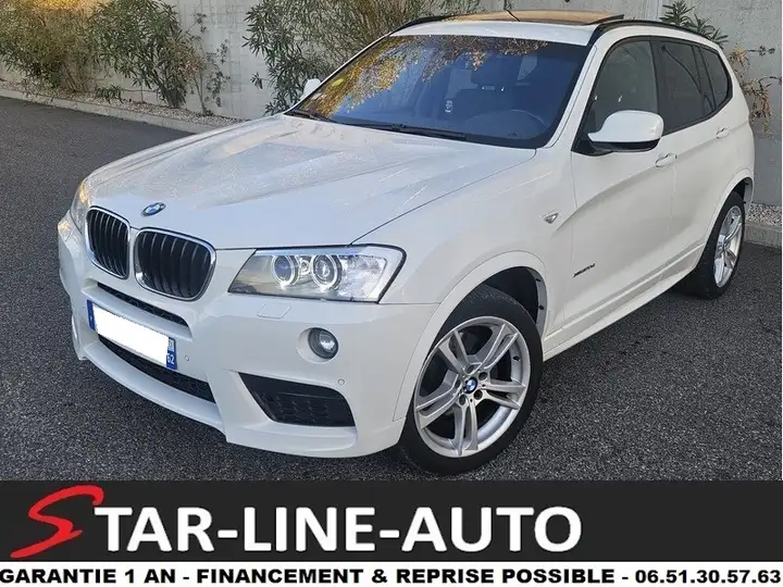 Pack m, Toit Panoramique, Toit Ouvrant, Caméra de Recul, Sièges Chauffants, 3ème feu de stop dans le becquet de hayon,5 places,ABS, y compris assistant de freinage et Contrôle de freinage en courbe CBC,Accoudoir central AR avec 2 porte-boissons intégrés,Accoudoir central AV avec espace de rangement,Affichage ,Affichage BMW EfficientDynamics dans le cadran d'instrumentation BMW Efficient Dynamics,Airbags conducteur et passager AV + latéraux + airbag de tête AV/AR,Antidémarrage électronique,Appel d'Urgence Intelligent,Application brillante ,Appuis-tête à toutes les places (actifs et réglables manuellement en hauteur et profondeur à l'AV),Autoradio BMW Professional 4x25 W, 6 haut-parleurs et lecteur CD compatible MP3,Banquette AR rabattable en 3 parties (40/20/40),Boîte de vitesses automatique à 8 rapports,Boîte de vitesses automatique avec palettes au volant,Bouton Start/Stop avec démarrage sans actionner la clé,Buses de lave-glace chauffantes (non visibles),Cache-bagages à enrouleur,Capteur d'impact (déverouillage du véhicule,Catadioptres rétro-réfléchissants intégrés à l'AR (gauche et droite),Ceintures de sécurité à 3 points d'ancrage à toutes les places,Ceintures de sécurité AV avec prétensionneur pyrotechnique et limiteur de tension à l'AV,Ciel de pavillon ,Climatisation automatique tri-zone avec aérateurs à l'AR,Coffre: Plancher réversible,Colonne de direction réglable manuellement en hauteur et en profondeur,Commande de verrouillage des portes dans les portes (conducteur + passager),Commande électrique du hayon avec ouverture/fermeture possible via un bouton dans le poste de conduite,Compartiments de rangement dans les portes AV/AR avec porte-bouteilles (1,Console centrale type F15 (commandes des systèmes de climatisation + audio) avec application brillante ,Construction allégée intelligente BMW Efficient Dynamics,Contrôle d'adhérence en descente (HDC),Contrôle de la transmission,Contrôle Dynamique de Stabilité DSC+ avec fonctionnalités étendues (y compris assistant de démarrage en côte),Contrôle dynamique de traction DTC,Controller iDrive avec touches d'accès direct et 8 touches de raccourci programmables,Désactivation de l'airbag passager avec témoin lumineux dans la console de toit,Détecteur de pluie et allumage automatique des projecteurs,Direction à assistance électrique (ESP) BMW Efficient Dynamics,Direction assistée avec Servotronic,Direction DirectDrive à démultiplication variable,Direction Servotronic à assistance variable en fonction de la vitesse,Eclairage de bienvenue soft-on/soft-off (ciel de pavillon à l'AV et à l'AR),Eclairage du coffre (à gauche et à droite),Ecran d'information central couleur 6,Ecran d'information de 2,7,Ecrous antivol de roues,Eléments extérieurs couleur carrosserie, pare-chocs partiellement peints,Entourage des vitres noir mat,Essuie-glace AR,Feux de route anti-éblouissement,Feux stop AR dynamique,Filet de séparation du coffre,Filets au dos des sièges AV et filet de bas d'habitacle côté passager AV,Filtre à particules,Fixation ISOFIX aux places latérales AR,Fonction ,Fonction d'arrêt et de redémarrage automatique du moteur BMW Efficient Dynamics,Frein de parking électromécanique avec fonction ,Grille de calandre chromée avec barres noires,Injection directe haute précision HPI BMW Efficient Dynamics,Inscription du modèle X3 à l'AR et de la motorisation sur les flancs latéraux,Inserts décoratifs en Aluminium brossé,Instrumentation de bord avec technologie LCD pour la partie basse,Interface Bluetooth et port USB,Interface Bluetooth pour téléphone portable (avec Streaming audio et fonction ,Jantes en alliage léger 18'' style 368 M à rayons en étoile,Kit aérodynamique M,Kit de mobilité BMW,Kit de rangement,Kit éclairage,Lave-projecteurs,Lève-vitres électriques AVet AR, commande par impulsion et protection anti-coincement,Ligne M Sport,Mesure individuelle de pression des pneumatiques,Mode ECO PRO avec fonction ,Mode ECO PRO sur le sélecteur de mode de conduite BMW EfficientDynamics,Motorisations BMW TwinPower Turbo: Diesel : composé d'un turbocompresseur à géométrie variable,Navigation multimédia Business,Ordinateur de bord, Check Control et indicateur de température extérieure,Pack Advanced Full LED,Pare-soleil AV avec miroir de courtoisie,Phares antibrouillard,Pneumatiques à faible résistance au roulement,Pneumatiques RSC permettant le roulage à plat,Port audio USB et prise AUX IN dans l'accoudoir central AV,Porte-boissons (2 dans la console centrale AV),Prises 12 V : 1 x dans la console centrale AV,Projecteurs antibrouillard à LED,Projecteurs halogènes avec fonction d'éclairage de jour (diurne) et réglage manuel de la portée,Protection contre les impacts latéraux,Radars de stationnement AV/AR PDC,Rails de toit Shadow Line brillant,Réglages individualisés Personal Profile mémorisés dans la radiocommande,Régulateur de vitesse avec fonction freinage,Renforcements noirs pour les pare-chocs, les seuils latéraux et les passages de roues,Respect de la norme EU6 BMW Efficient Dy