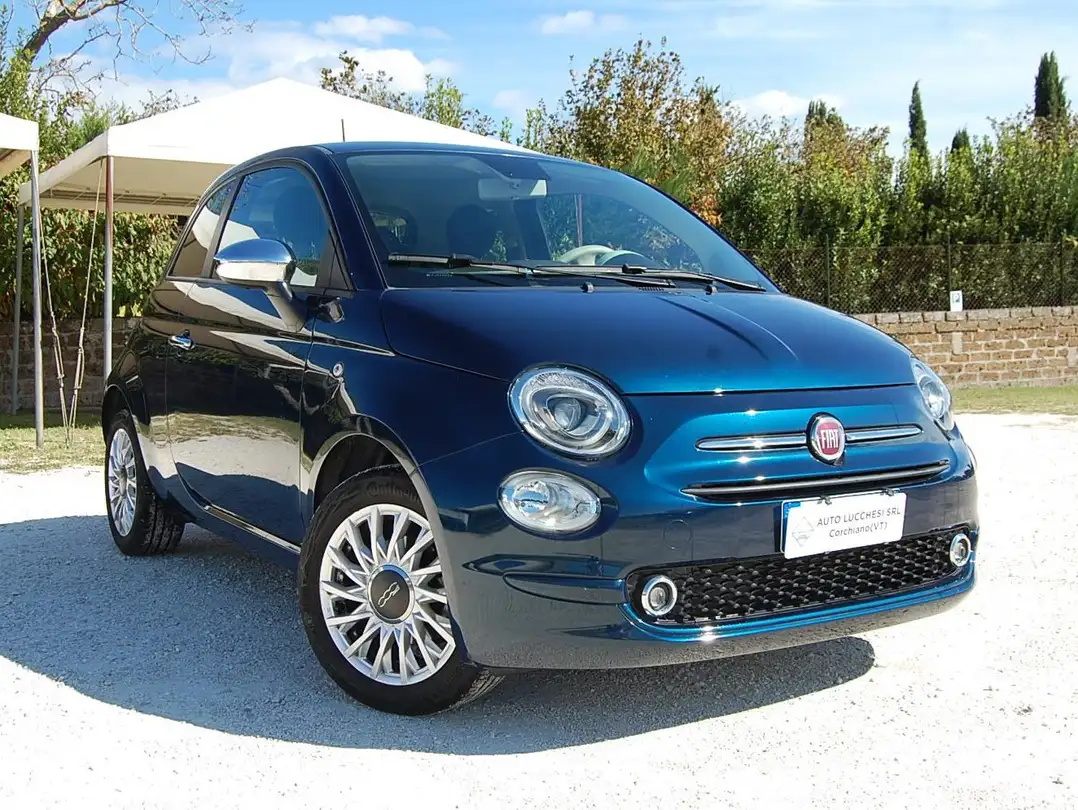 La carrozzeria blu metallizzato esalta le linee sinuose e il design iconico della FIAT 500, rendendola immediatamente riconoscibile.