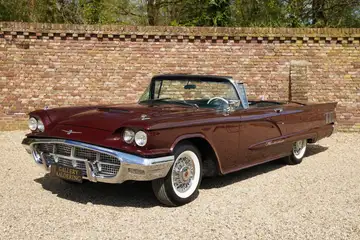 Deze Thunderbird dateert uit 1 juli 1960, gemaakt in Michigan, VS. De eerste eigenaar bestelde Deze Thunderbird in de kleur Royal Burgundy Metallic met een zwart leren interieur; de kleurencombinatie die de wagen nu nog steeds heeft. Het geheel staat er netjes bij, zowel het exterieur, interieur als mechanisch. We kunnen het exterieur omschrijven als netjes met mooi chroomwerk en ruiten in goede staat. Daarnaast ziet de carrosserie er verzorgd uit. De soft-top is ook netjes.