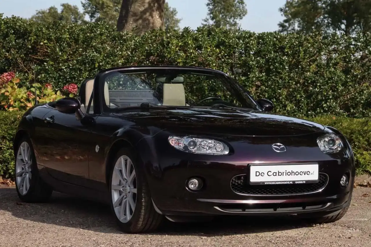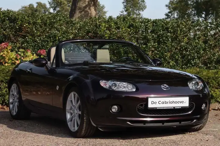 Deze bijzondere Mazda MX-5 NC 1.8l Mithra Edition is uitgevoerd in de stijlvolle kleur Radiant Ebony Metallic, een diepe donkerpaarse tint die in het zonlicht overloopt van warm paars naar glanzend zwart.