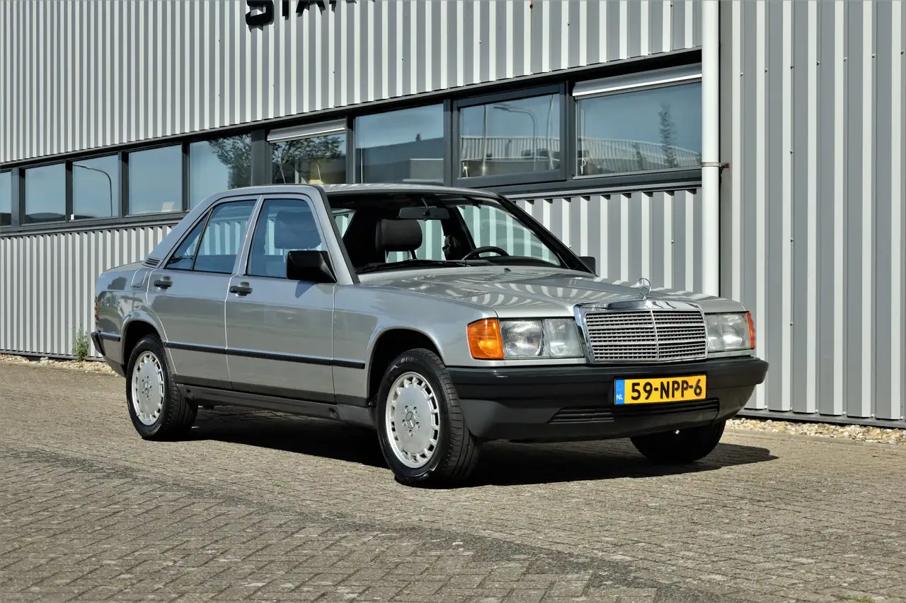 Super leuke belastingvrije Mercedes 190E, uitgevoerd in zilvergrijs metallic met een zwart stof interieur; een klassieke combinatie.