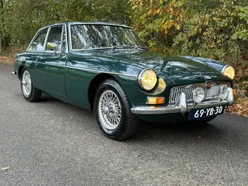 Zeer nette MG B GT uit 1973, in de klassieke kleur British Racing Green met chromen bumpers en spaakwielen.