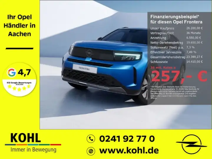 Gerne unterbreiten wir Ihnen ein maßgeschneidertes Finanzierungs- oder Leasingangebot zu unseren über 300 sofort verfügbaren Fahrzeugen. Eine große Auswahl hierzu finden Sie incl. Finanzierungs- und Leasingangebot unter: https://fahrzeugsuche.opelkohl.de