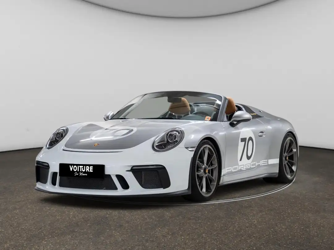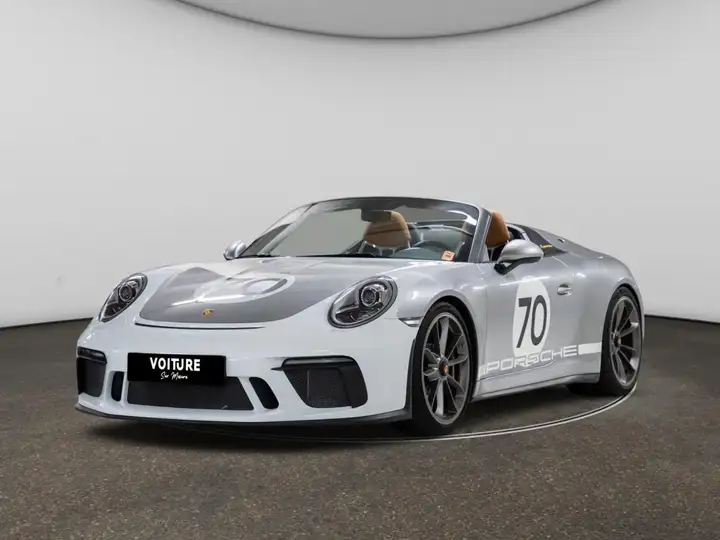 Fianacement possible : LOA/Crédit Malus inclus dans le prix Le véhicule est équipé du Pack Heritage Design, qui inclut les éléments suivants : Avancées dans les dossiers de siège peintes en Argent GT métallisé Baguettes de seuil de porte en acier inoxydable Noir anodisé portant l'inscription « Speedster » Buses d'aération en cuir Cache de la console centrale en cuir Noir Clé du véhicule peinte en Argent GT métallisé avec écusson Porsche historique Couvercle du coffre de rangement avec estampage « Porsche Exclusive Manufaktur » Dossiers des sièges peints en Argent GT métallisé Ecusson Porsche historique sur le capot avant et les enjoliveurs de roue Ecusson Porsche sur les appuie-tête Elégante inscription « Speedster » dorée sur la baguette décorative du tableau de bord Etriers de freins PCCB noir Etui à clé en cuir couleur Cognac avec estampage « Speedster » Gicleurs de lave-phares en blancs Graphisme issu sport au style Heritage Design en blanc sur la capot et les portes Housse de protection Inscription Speedster dorées à l'arrière et sur les côtés des streamliners Jantes peintes platine satinée ou argent Levier de vitesses avec schéma des rapports couleur Cognac Pack intérieur peint en Argent GT métallisé Pare-chocs avant Blanc Pare-soleil en cuir Partie inférieure du tableau de bord, accoudoirs, couvercle du coffre de rangement de la console centrale et poignées de porte en cuir naturel Cognac Plaquette Édition limitée avec logo anniversaire doré Sièges baquets intérieur tout cuir bicolore noir/Cognac Signature 'Porsche' en blanc Tapis de sol avec ganse en cuir noir Volant sport GT intégralement en Noir avec repère 12 h en cuir couleur Cognac avec écusson Porsche historiqueLes options : Caméra de recul, HomeLink (système d'ouverture de porte de garage), Jantes peintes en Platine (finition satinée), Nombre individuel pour Pack Heritage Design, Porsche Communication Management (PCM) avec module de navigation, Régulateur de vitesse, Réservoir de 90 litres, Système de levage de l'essieu avant, Boîte manuelle GT Sport à 6 rapports avec démultiplication sportive et double débrayage, Cabriolet 2 places, Capot arrière en matière plastique renforcée en fibres de carbone dans la teinte de la carrosserie avec double bossage, Capot avant et ailes en matière plastique renforcée en fibres de carbone dans la teinte de la carrosserie, Capote Speedster allégée, manuelle avec verrouillage électrique, Climatisation automatique séparée conducteur / passager avec recyclage automatique de l'air, Crossbar Speedster avec badge '70 Years Porsche - n of 1948' entre les deux sièges, Essieu arrière avec roues directrices