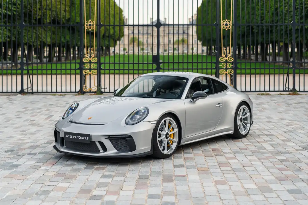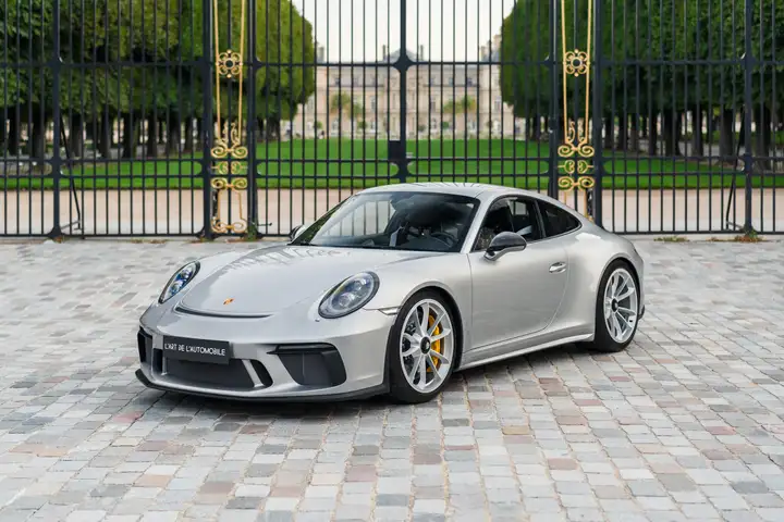 La Porsche 991.2 GT3 Touring que nous proposons à la vente dispose d'une superbe configuration Argent GT assortie aux jantes argent et aux étriers jaunes caractéristiques des freins céramique, avec l'intérieur en cuir noir et les sublimes coutures contrastantes Argent GT. Cette auto est idéalement équipée avec entre autres le lift, les feux PDLS+, les sièges baquets 918 Spyder, l'audio BOSE le pack Sport Chrono ou encore les inserts intérieur en carbone. Cette 991 a parcouru seulement 7 200 kms et se présente dans un état tout à fait neuf, d'autant plus que son bloc avant est recouvert d'un film de protection. Elle est à jour de révision.