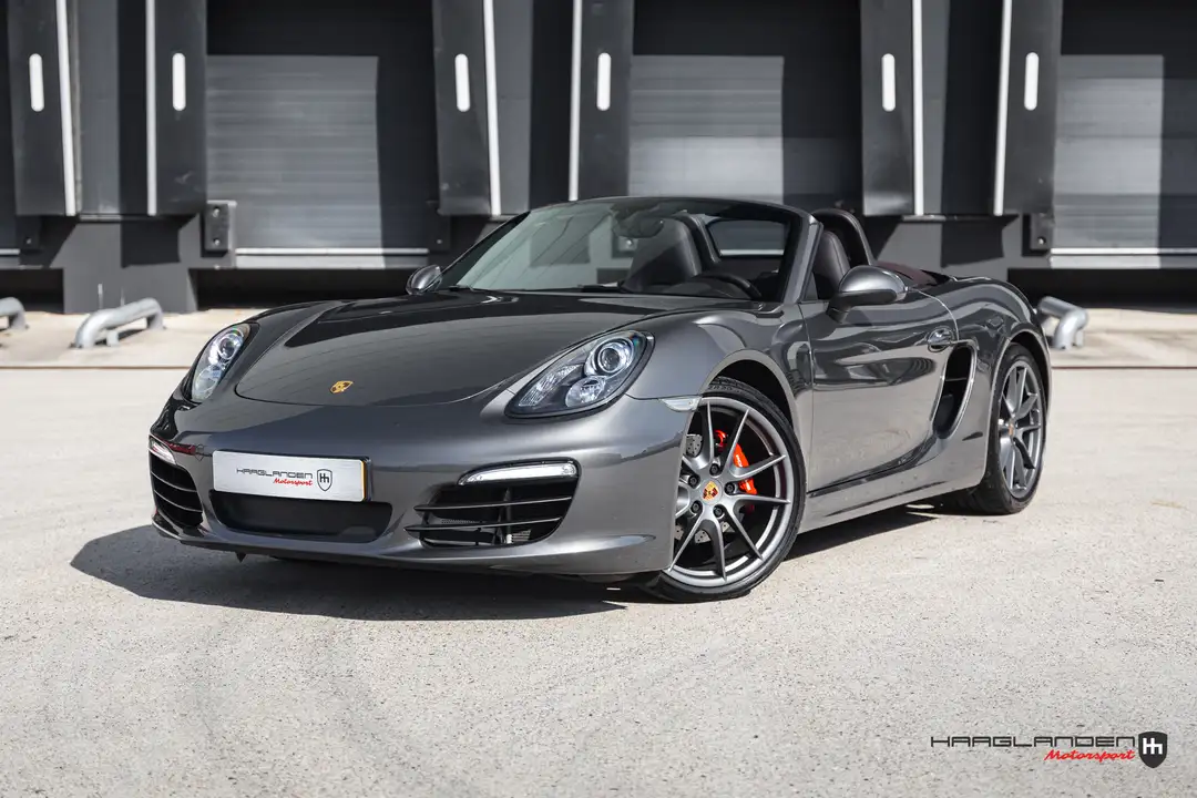 Deze Nederlands geleverde Porsche Boxster uit 2013, uitgevoerd in de geliefde kleur Agaat grijs metallic met een fraaie optielijst. Zo heeft hij onder andere GTS achterlichten, 20 inch Carrera S wielen afgewerkt met een matte blanke lak, een inschakelbare Sportuitlaat en het Sport Paddle stuur. Deze opties dragen bij aan het sportieve karakter van de Boxster. Uiteraard voorzien van een bluetooth telefoonmodule en PCM navigatiesysteem. Het gehele interieur is voorzien van leder (dashboard, bekleding van de portieren, verwarmbare stoelen), in een cacao bruine kleur evenals de cabrio kap, wat heel mooi combineert met de agaat grijze metallic lak van het exterieur. De elektrisch bedienbare kap kan zelfs tijdens het rijden of op de sleutel worden bediend. Deze Boxster type 981, voorzien van de heerlijke 6-cilinder Boxer motor, is een wel heel leuke Porsche. In 2012 kwam hij op de markt en is duidelijk groter dan zijn voorganger. Daar waar zijn voorganger ronde lijnen had en wat lieflijk oogde, is dit nu een heel strak gelijnde stoere sportwagen. Herkenbaar aan zijn geluid, zijn hoge koppel en fantastische rij-eigenschappen. Gekoppeld aan een 7-versnellingsbak PDK is dit een fantastische combinatie.