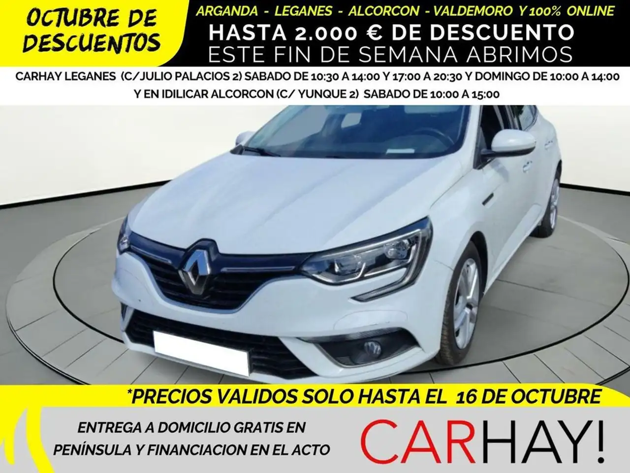 COMPRA TU COCHE ONLINE O EN CUALQUIERA DE NUESTROS CENTROS Y SI ERES DE FUERA DE MADRID TE LO ENVIAMOS GRATIS A CUALQUIER PUNTO DE LA PENÍNSULA CON NUESTRO SERVICIO DE ENTREGA A DOMICILIO, CONTACTA CON NOSOTROS Y TE ENVIAMOS HISTORIAL DE MANTENIMIENTO, PERITACION Y CERTIFICADOS, TE CALCULAMOS LA FINANCIACIÓN Y TE ACLARAMOS CUALQUIER DUDA, y si lo prefieres visítanos en nuestros centros de Leganes, Arganda y Alcorcón.