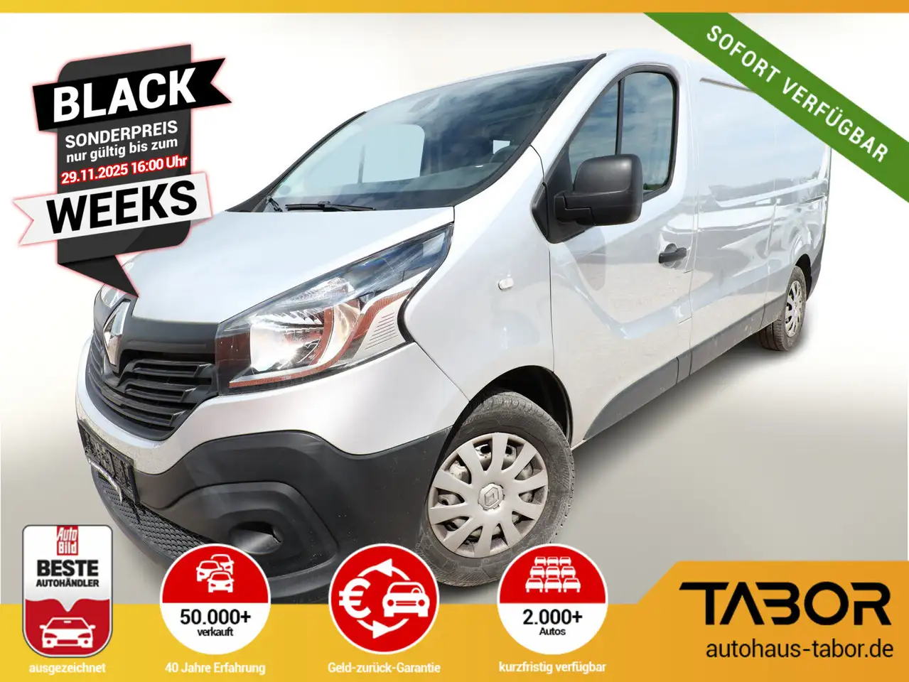 Klang & Klima-Paket inkl. Navigationssystem (Audio-Navigationssystem mit Touchscreen-Farbdisplay (Media Nav Evolution) / Freisprecheinrichtung Bluetooth / USB-Anschluss inkl. AUX-IN-Anschluss (Plug & Music) / Klimaanlage), Einparkhilfe hinten mit Rückfahrkamera (Rückfahrkamera), Anhängerkupplung, Mobiles Büro-Paket 2 (Außenspiegel mit Weitwinkel / Sitze im Fahrerhaus: Beifahrerdoppelsitz umwandelbar / Laderaumtrennwand mit Durchlademöglichkeit und Fenster), Airbag Beifahrerseite (Airbag Beifahrerseite abschaltbar), Klare-Sicht-Paket (Licht- und Regensensor / Nebelscheinwerfer), Schiebetür Lade-/Fahrgastraum rechts mit Verglasung, Radvollabdeckungen, Reifen 215/65 R17, SCR System, Sitze im Fahrerhaus: Fahrersitz Komfort 3-fach verstellbar (Sitze im Fahrerhaus: Beifahrersitz mit Armlehne), Batterie 85 Ah, Drehzahlmesser, Heckflügeltüren ohne Verglasung, Innenraumfilter: Pollenfilter, Karosserie/Aufbau: Kasten, Kraftstofftank: 80 Ltr., Lenksäule (Lenkrad) verstellbar, Motor 1,6 Ltr. - 107 kW dCi Diesel Energy, Nebelschlussleuchte, Radstand 3498 mm, Reifen-Reparaturset, Schadstoffarm nach Abgasnorm Euro 6, Sitzbezug / Polsterung: Stoff, Anti-Blockier-System (ABS), Antriebs-Schlupfregelung (ASR), Antriebsart: Frontantrieb, Elektron. Stabilitäts-Programm (ESP), Wegfahrsperre, Getriebe 6-Gang, Airbag Fahrerseite, Fensterheber elektr. vorn, Impulsgeber links, Keyless-Entry, Verzurrösen im Laderaum seitlich, Verzurrösen Laderaumboden, Bordcomputer, Wärmeschutzverglasung, Servolenkung, Außenspiegel elektr. verstell- und heizbar, Einschaltautomatik für Fahrlicht, Tagfahrlicht, Rußpartikelfilter, Start/Stop-Anlage Motor