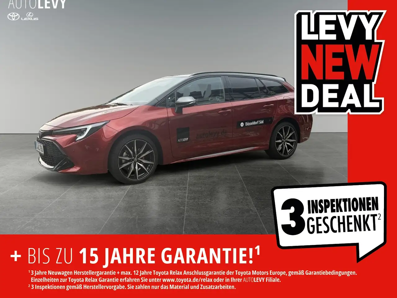 - Bis zu 15 Jahre Garantie (3 Jahre Neuwagenherstellergarantie und max. 12 Jahre Toyota Relax Anschlussgarantie der Toyota Motor Europe - gemäß Garantiebedingungen unter www.toyota.de/relax) und 3 Inspektionen (4.,5. und 6. Jahresinspektion, Details siehe autolevy.de/garantieversprechen) geschenkt. Inspektion gem. Herstellervorgabe zzgl. Material und Zusatzarbeiten – nur gültig in unseren Filialen.