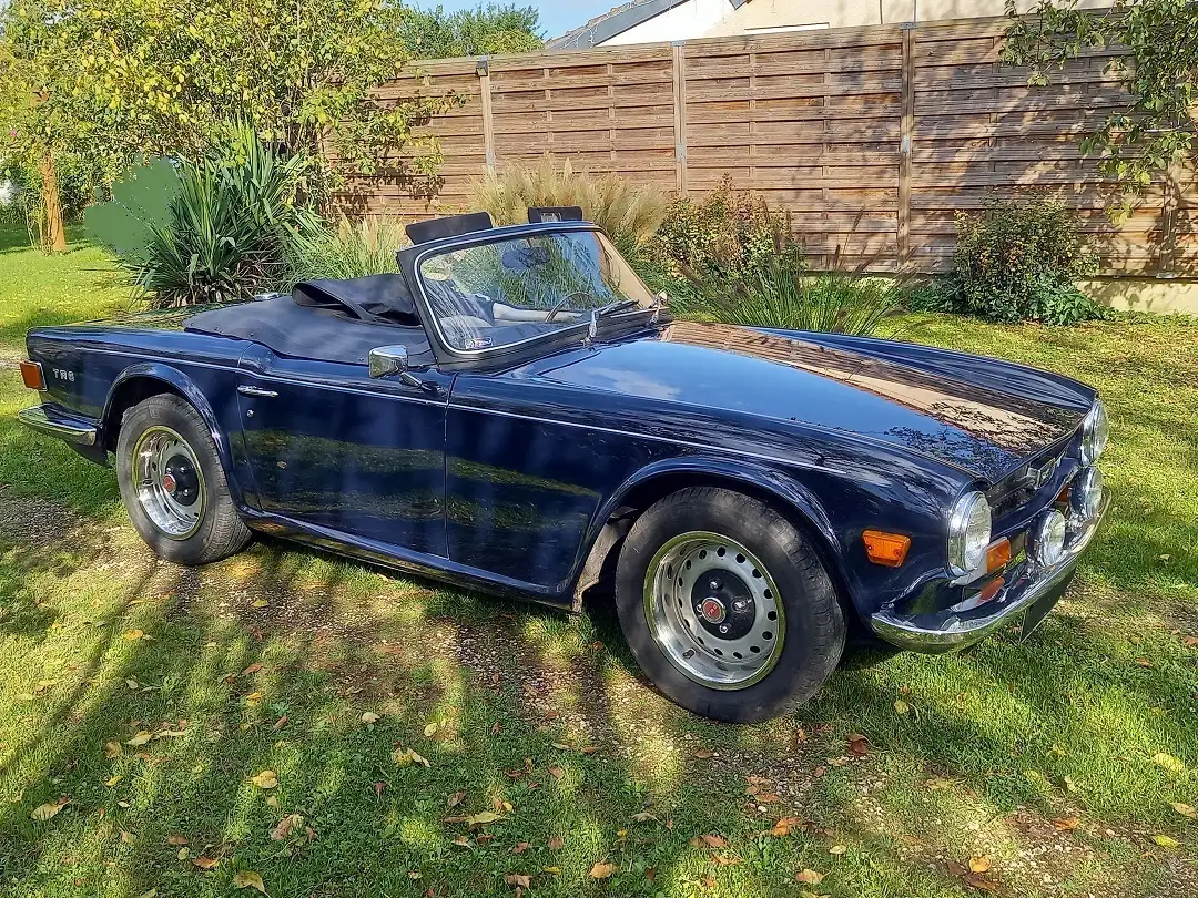 Triumph TR6 PI 150ch Overdrive 1971. Carte Grise Française Normale. CT OK jusqu'à sept 2027. Matching Numbers, British Heritage Certificate. Royal Blue, moquettes bleue assorties, intérieur cuir crème. Couvre tonneau, pompe à essence Pierburg. Propriétaire depuis 2014. Révision en juillet 2025 (freins AV, toutes vidanges, roulement de roue AR, durits etc). Toutes transmissions (pont, arbre longitudinal, transmissions transversales) très peu de kilomètres. Restauration par professionnel spécialiste anglaises en 2014, peu de kilomètres depuis : peinture, moquettes, tableau de bord, volant, capote et couvre capote bleu en alpaga, direction, maitre cylindres, échappement sport inox dble sortie, pare-chocs etc Factures. Historique intéressant.