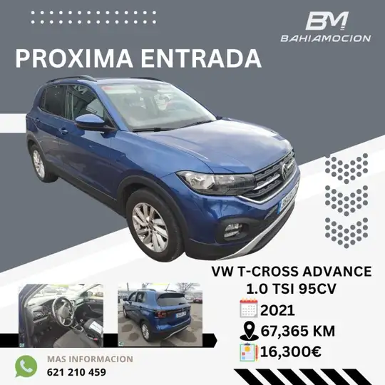VW T CROSS 1.0TSI 95CV ADVANCE, Matriculado 01/11/2021, Vehículo en perfectas condiciones, bajo consumo y mantenimiento. Sensores de Aparcamientos Del. y Tras, Asistentes de salida voluntaria de Carril, Front Asist, Climatizador automático de tres zonas, Pantalla 12', Antinieblas delanteros, Control de crucero, volante multifunción, control de control de estabilidad esp, sensor de presión de neumáticos, espejos eléctricos calefactados. . . 12 meses de garantía, transferencia a nombre de nuevo comprador incluidos. pregunte por nuestra financiación. recogemos además su vehículo como parte de pago. no lo dude y llámenos, le atenderemos encantados. somos SEAT Y KIA en El Puerto de Santa Maria y Rota.