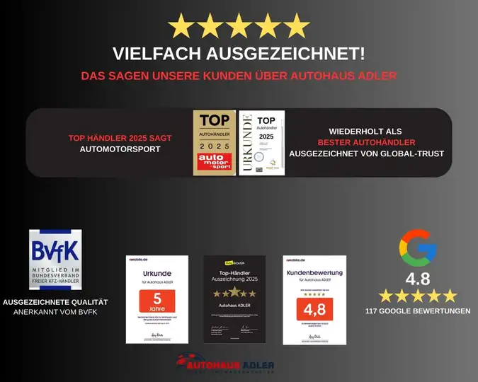 ZWISCHENVERKAUF UND IRRTÜMER FÜR DIESES ANGEBOT SIND AUSDRÜCKLICH VORBEHALTEN. DIE FAHRZEUGBESCHREIBUNG DIENT LEDIGLICH DER ALLGEMEINEN IDENTIFIZIERUNG DES FAHRZEUGES UND STELLT KEINE ZUSICHERUNG IM KAUFRECHTLICHEN SINNE DAR. AUSSCHLAGGEBEND SIND EINZIG UND ALLEIN DIE VEREINBARUNG IN DER AUFTRAGSBESTÄTIGUNG ODER IM KAUFVERTRAG. ALLE ANGABEN OHNE GEWÄHR. DEN GENAUEN AUSSTATUNGSUMFANG ERHALTEN SIE VON UNSEREM VERKAUFSPERSONAL. BITTE KONTAKTIEREN SIE UNS.