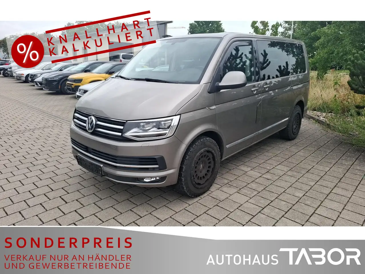 Standheizung mit Fernbedienung, Zeitschaltuhr und Zuheizer (2. Batterie), Sound-System DYNAUDIO (digital), Audio-Navigationssystem Discover Media Plus (Touchscreen-Farbdisplay) (Lautsprecher (8) / Mobile Online Dienste App-Connect / Radioempfang digital (DAB+) / Sprachverstärkung elektronisch / Sprachsteuerungs-System / Volkswagen Media Control / Volkswagen Media Control und App-Connect), Adaptive Fahrwerksregelung (DCC), Lackierung: Metallic-Lackierung, Anhängerkupplung (Kugelkopf abnehmbar) (Anhänger-Stabilisierungs-Programm), Seitenairbag / Kopfairbag (Curtain-Airbag) vorn und Kopfairbag (Curtain-Airbag) hinten, Multiflex-Board mit Polsterauflage, Mobiltelefon Schnittstelle Comfort und WLAN-Hotspot (WLAN-Hotspot), Fahrassistenz-System: Einparkhilfe vorn und hinten mit Rückfahrkamera (Rückfahrkamera), Frontscheibe Dämmglas, heizbar, Ausführung: BlueMotion Technology, Reserverad in Fahrbereifung, Kraftstofftank: 80 Ltr., Freilaufkupplung für Doppelkupplungsgetriebe, Winterbereifung zusätzlich (Kundenangabe erforderlich), Außenspiegel und Türgriffe außen in Wagenfarbe (Außenspiegel in Wagenfarbe / Türgriffe außen in Wagenfarbe), Ausstattungs-Paket Licht + Sicht (Innenspiegel mit Abblendautomatik / Automatische Fahrlichtschaltung / Lichtassistent (Coming Home, Leaving Home) / Regensensor), Dämmglas-Paket (Verglasung hinten abgedunkelt / Fenster im Fahrerhaus: Seitenscheiben Doppelverglasung / Fenster im Lade-/FG-Raum: Doppelverglasung, abgedunkelt / Heckscheibe Doppelverglasung / Dämmglas mit Wischanlage), Sitze im Fahrerhaus: Lendenwirbelstützen Fahrer- und Beifahrersitz (Sitze im Fahrerhaus: Lendenwirbelstütze Beifahrersitz / Sitze im Fahrerhaus: Lendenwirbelstütze Fahrersitz), Elektron. Stabilitäts-Programm (ESP) mit Bremsassistent, ASR/ABS, EDS und Berganfahrhilfe (Fahrassistenz-System: Berganfahr-Assistent), Klimaautomatik Climatronic (Fahrerhaus + Lade-/Fahrgastraum) (Dachverkleidung Himmel Komfort mit Luftausströmer), Sitze im Fahrerhaus: Fahrer- und Beifahrersitz mit Armlehnen vorn (Sitze im Fahrerhaus: Armlehnen, Beifahrersitz / Sitze im Fahrerhaus: Armlehnen, Fahrersitz), Fahrassistenz-System: Autom. Distanzregelung (ACC) und Umfeldbeobachtungssystem (Front Assist) (Fahrassistenz-System: City-Notbremsfunktion / Fahrassistenz-System: Umfeldbeobachtungssystem (Front Assist) mit City-Notbremsfunktion), Lenkrad (Leder) mit Multifunktion (Schalt-/Wählhebelgriff Leder), Scheinwerfer und Heckleuchten LED (Leuchtweitenregelung automatisch / Scheibenwaschdüsen beheizt und Anzeige für Waschwasserstand / Heckleuchten LED, rot / Scheinwerfer LED / Scheinwerfer-Reinigungsanlage (SRA) / Tagfahrlicht LED), Abdeckung Schiebetürleiste, Armaturentafel Komfort, Außenspiegel asphärisch, links, Außenspiegel konvex, rechts, Bodenbelag im Fahrerhaus: Teppich, Bodenbelag: Teppich verstärkt, Chromleisten Stoßfänger vorn, seitlich und Heckklappe unten, Doppeltonfanfare, Fahrassistenz-System: Multikollisionsbremse (Multi Collision Brake), Fahrwerk 17", Fenster im Lade-/FG-Raum: - feststehend, vorn und hinten links, Fenster im Lade-/FG-Raum: - feststehend, vorn und hinten rechts, Funkschlüssel (2) klappbar, Fußmatten Fahrerhaus: Velours, Haltegriffe A-Säulen, Handschuhfach abschließbar, Heckklappe mit Verglasung, Heckscheibe heizbar, mit Wischanlage, Innenausstattung: Dekoreinlagen Dark Silver brushed (Dekorband Black Glossy), Innenleuchten im Fahrerhaus: Leseleuchten vorn (2), Innenleuchten im Lade-/FG-Raum: Trittstufenleuchten, Innenraumfilter: Pollenfilter, Karosserie/Aufbau: Bus, Kindersicherung an den Schiebetüren, Klapptisch integriert Lade-/Fahrgastraum, Kühlergrill schwarz lackiert, mit Chromleisten, Ladekanten-/ Trittstufenabdeckungen in Edelstahl, Lenksäule (Lenkrad) verstellbar, Motor 2,0 Ltr. - 150 kW TDI, Multifunktionsanzeige Premium (Farbdisplay), Nichtraucher-Paket, Radstand 3000 mm, Schadstoffarm nach Abgasnorm Euro 6, Schiebetür Lade-/Fahrgastraum rechts, SCR-System (AdBlue-Technologie), Sitzbezug / Polsterung: Alcantara, Sitze im Fahrerhaus: Beifahrersitz Komfort, Sitze im Fahrerhaus: Fahrer- und Beifahrersitz höhenverstellbar, Sitze im Fahrerhaus: Fahrersitz Komfort, Sitze im Lade-/FG-Raum: 2.Reihe, 3er-Sitzbank, Sonnenblenden mit Spiegel (beleuchtet), Steckdose (12V-Anschluß) im Fahrerhaus, Stoßfänger in Wagenfarbe, Türablagekasten vorn, Verkleidung im Lade-/FG-Raum: Komfort, Zul. Gesamtgewicht 3,00 t, Multimedia-Schnittstelle USB (iPhone / iPod) mit AUX-IN, Anti-Blockier-System (ABS), Fahrassistenz-System: Bremsassistent (HBA), Antriebsart: Allradantrieb, LM-Felgen 7x17 (Devonport), Wegfahrsperre (elektronisch), Getriebe 7-Gang - Doppelkupplungsgetriebe DSG, Zuheizer, Airbag Beifahrer abschaltbar, Airbag Fahrer-/Beifahrerseite, Fensterheber elektrisch, Sitze im Fahrerhaus: Fahrer- und Beifahrersitz heizbar, Sitze im Lade-/FG-Raum: 1.Reihe, 2 Drehsitze, Sonnenschutzrollo im Fahrgastraum, Zentralverriegelung mit Fernbedienung und Innenbetätigung, Seitenscheiben Dämmglas, Servolenkung, Außenspiegel elektr. verstell-, heiz- und anklappbar, Nebelscheinwerfer mit integriertem Abbiegelicht, Fahrassistenz-System: Müdigkeitserkennungs-Sensor, Fahrassistenz-System: Spurwechselassistent (Side Assist / Blind Spot Sensor), Reifenkontroll-Anzeige, Rußpartikelfilter, Start/Stop-Anlage Motor