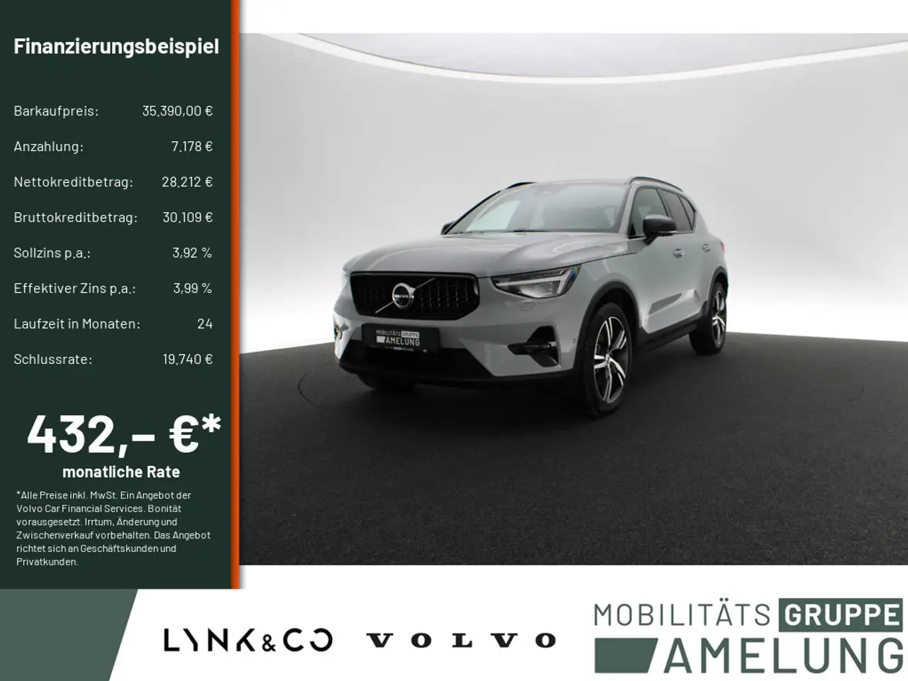 *Ein Aktions Zielfinanzierung-Finanzierungsbeispiel der Volvo Car Financial Services, Santander-Platz 1, 41061 Mönchengladbach für Privatkunden und Geschäftskunden: 432,08 EUR monatl. Rate, 3,99 Prozent eff. Jahreszins bei 24 Monaten Laufzeit, einer Anzahlung von 7.178,00 EUR und einer Schlussrate von 19.739,50 EUR. (Sollzins gebunden p.a. 3,92 Prozent, Gebühren 0,00 EUR, Bruttokreditbetrag: 30.109,30 EUR, Nettokreditbetrag: 28.212,00 EUR)
